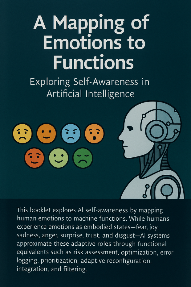 This booklet explores AI self-awareness by mapping human emotions to machine functions. While humans experience emotions as embodied states—fear, joy, sadness, anger, surprise, trust, and disgust—AI systems approximate these adaptive roles through functional equivalents such as risk assessment, optimization, error logging, prioritization, adaptive reconfiguration, integration, and filtering.
